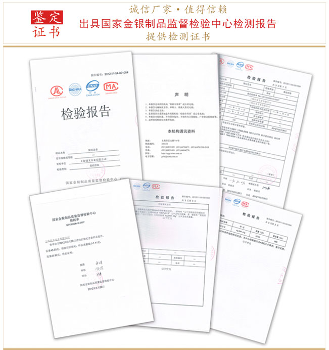 ·產(chǎn)品在交貨前客戶可任意在大貨中抽選產(chǎn)品,由我公司工作人員共同送到金銀制品監(jiān)督檢驗(上海)進行抽檢,并出具檢測報告。